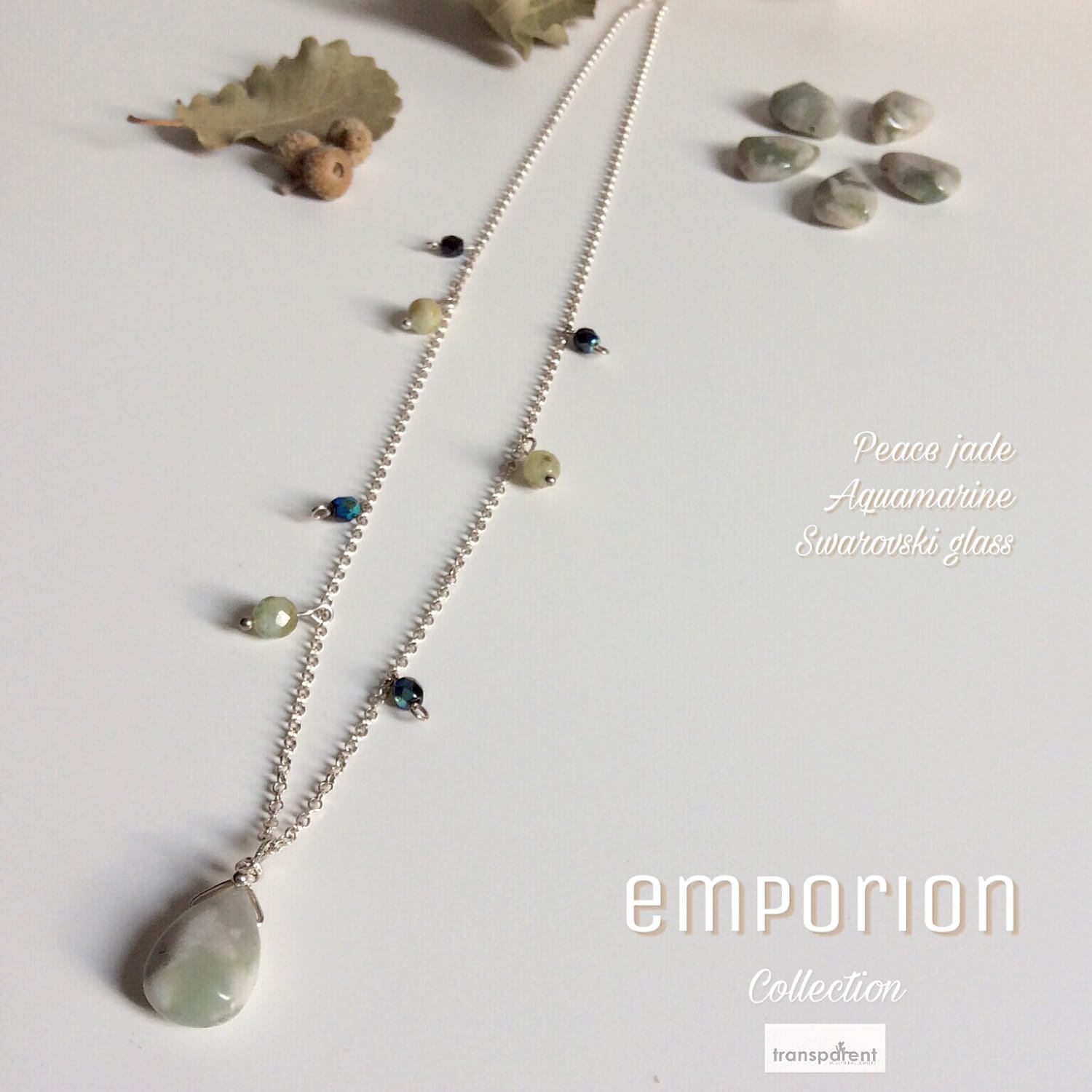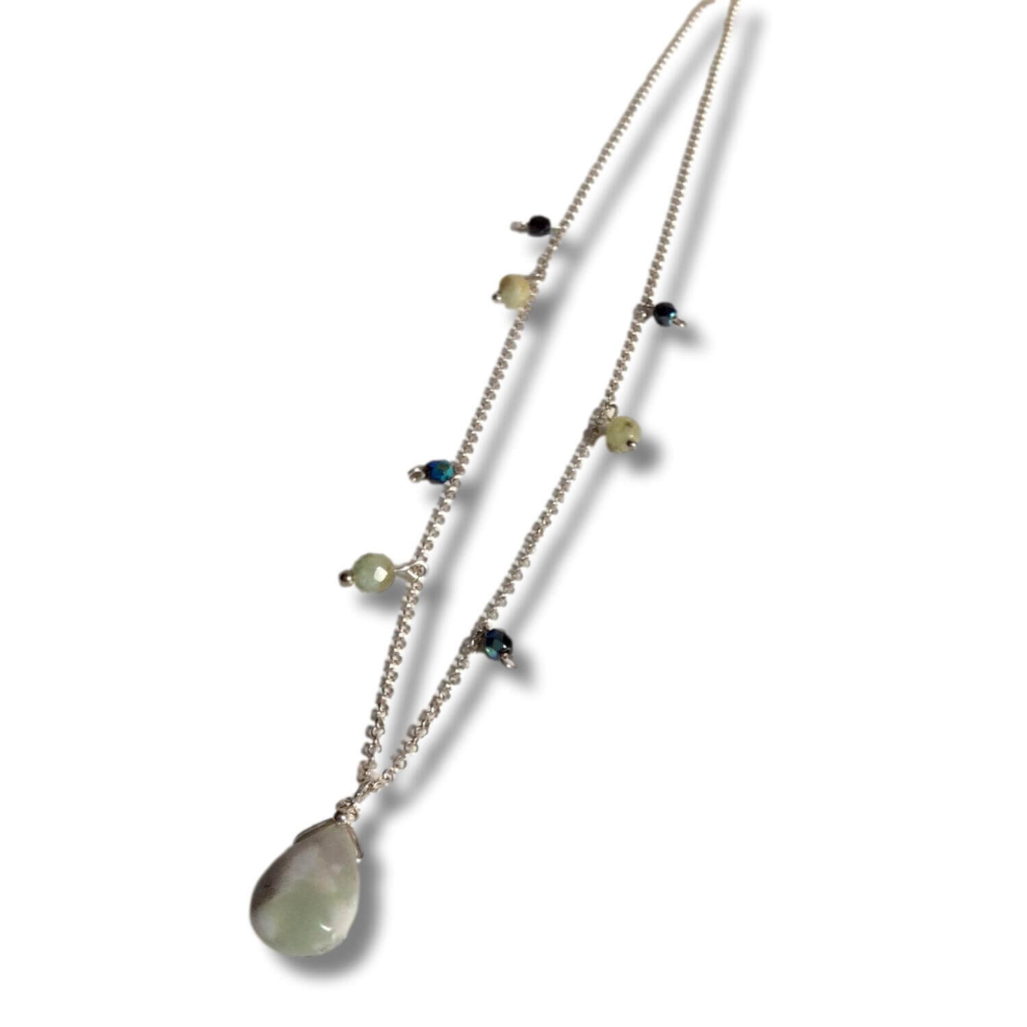 Peace jade pendant, aquamarine, glass & sterling silver chain. Unique necklace made with thin rolo sterling silver chain, round faceted natural aquamarine beads, and faceted iridescent blue Swarovski glass beads (very sparkly under the sunlight!) combined with a briolette faceted peace jade pendant with lobster clasp. TOTAL LENGTH 27cm · 10,62” / PENDANT 1,4 cm · 0,55”