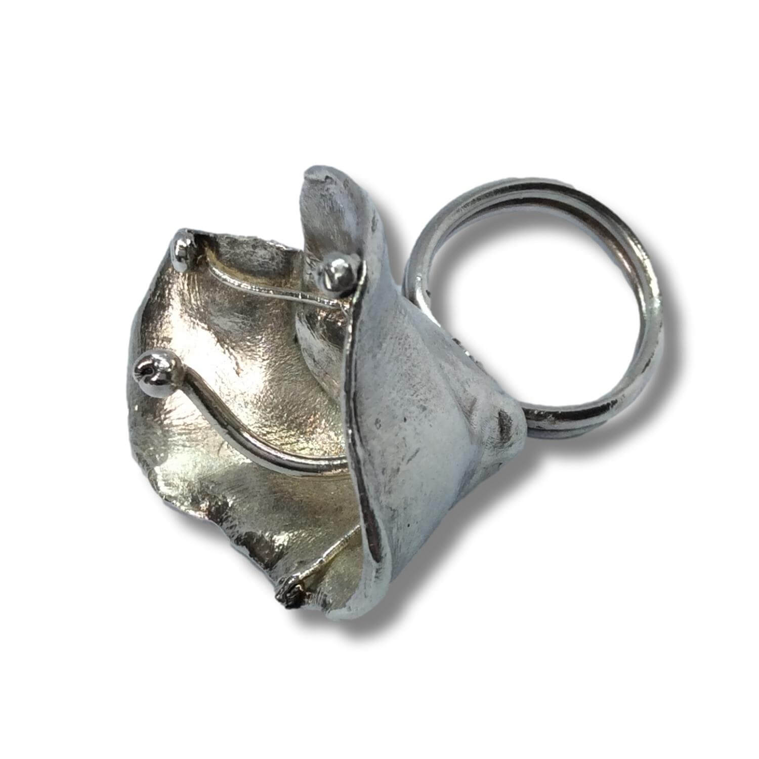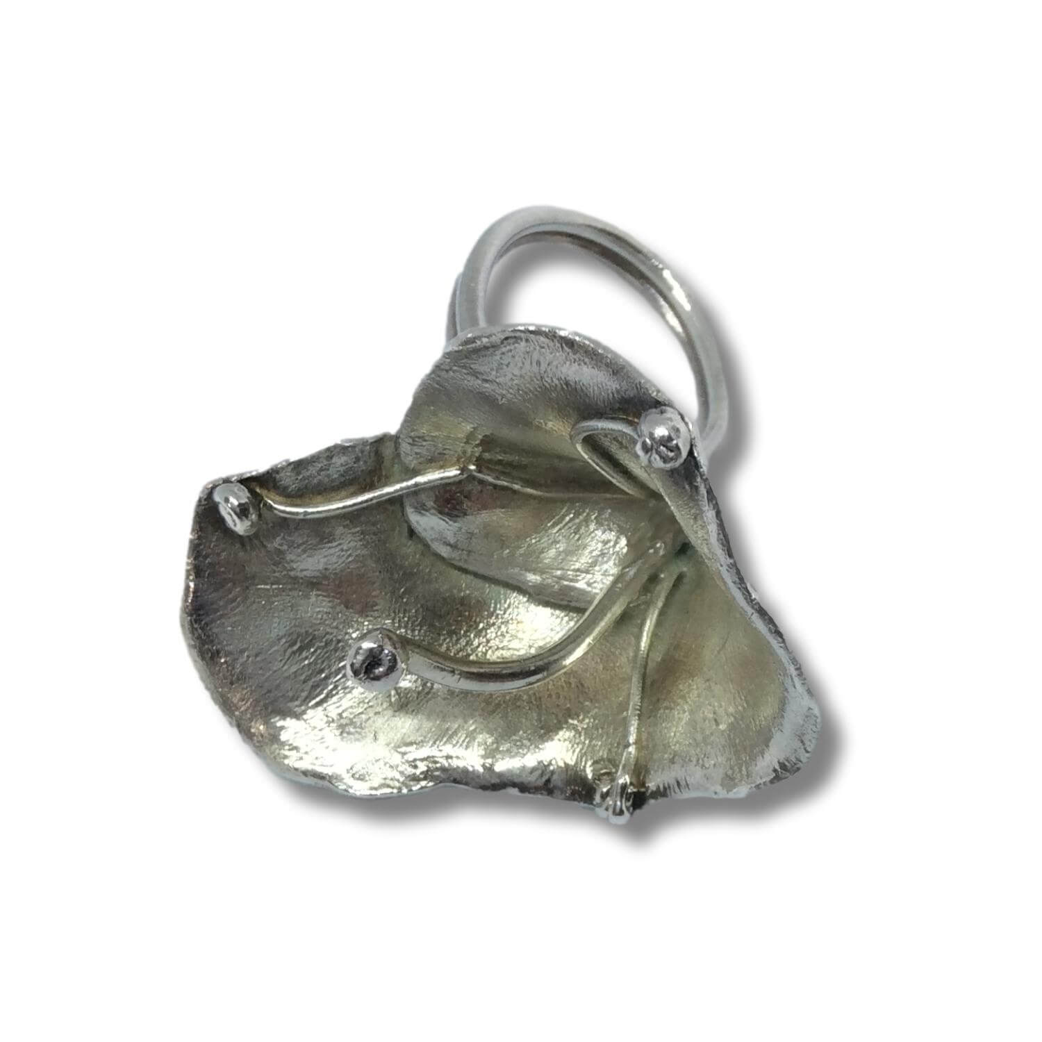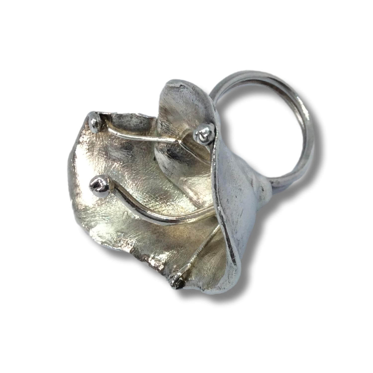 Sterling silver. Unique sculptural ring inspired by flowers, handmade in textured sterling silver, ergonomic for the index finger. Ancient lost wax casting technique. SIZE 17,5 EU · 8 USA / TOTAL LENGHT 4,5cm x 3,1 cm · 1,77” x 1,22”