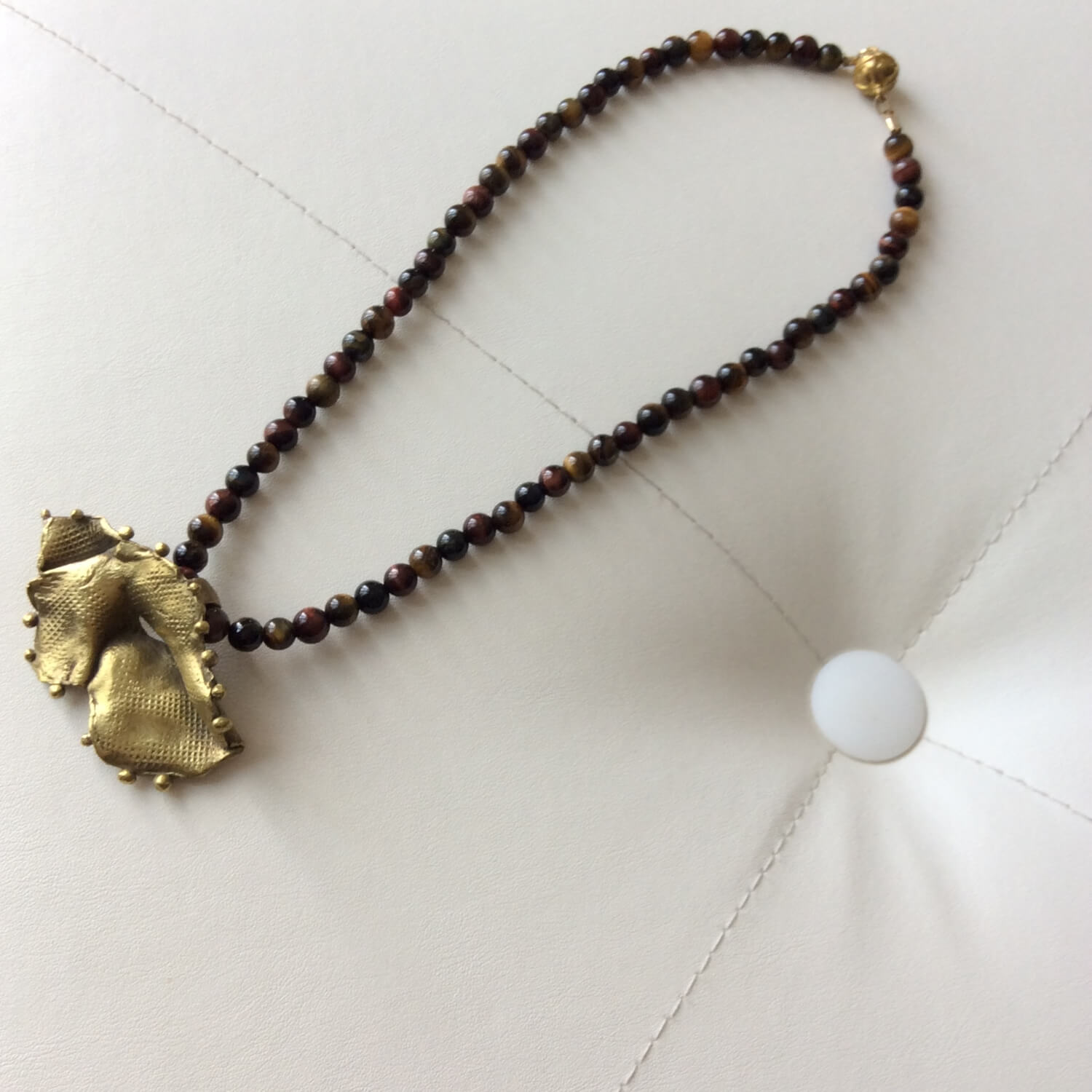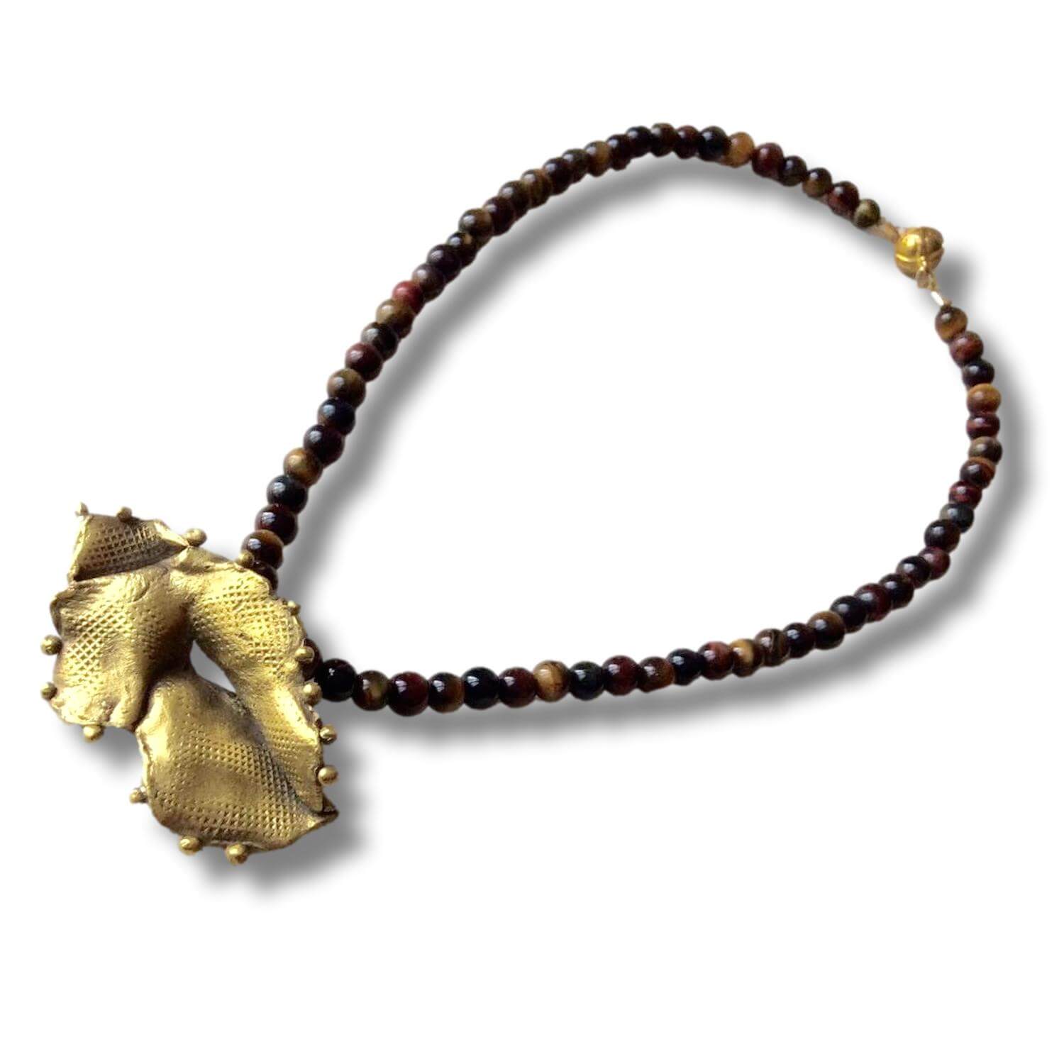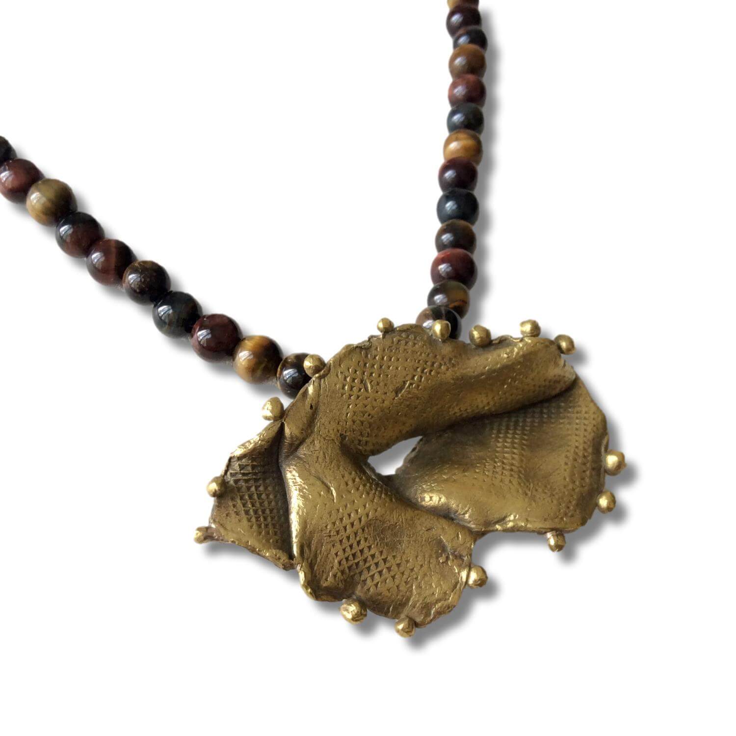 Brass textured pendant & round tiger´s eye beads. Unique sculptural necklace inspired by marine tridacna shell handmade in textured brass using the ancient lost wax casting technique. TOTAL LENGHT 24 cm · 9,44“/ PENDANT 5,8 cm · 2,28”